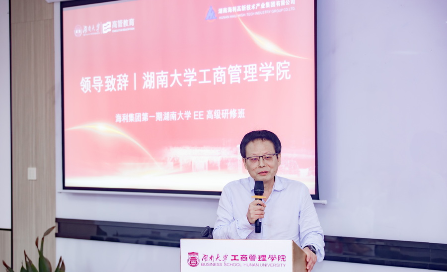 开班仪式上,杨智代表湖南大学工商管理学院致欢迎辞,对海利集团培训班的顺利开班表示衷心地祝贺。他指出,海利集团作为湖南首家上市公司,位列中国化工500强和农药行业百强,此次开班正是对改革创新精神与实战能力的生动践行。学院高度重视本次培训班,EE中心项目团队与集团紧密协作,通过深入调研,全面掌握行业发展动态、企业经营现状及人才梯队建设需求,梳理出集团当前亟待解决的6大核心问题。在课程体系设置上,结合人工智能发展趋势,融入博弈思维、AI技术应用、数字化与智能化转型等前沿内容,确保符合集团战略转型升级需要。在培训形式上,从过去传统的老师授课模式转化为老师带领学员共同思考解决企业问题的互动模式。同时,还增加了课题研究环节,学院为课题组提供专业指导,通过对标标杆企业、专题研讨和头脑风暴等方式,探讨形成高质量的课题解决方案,助推企业高质量发展。