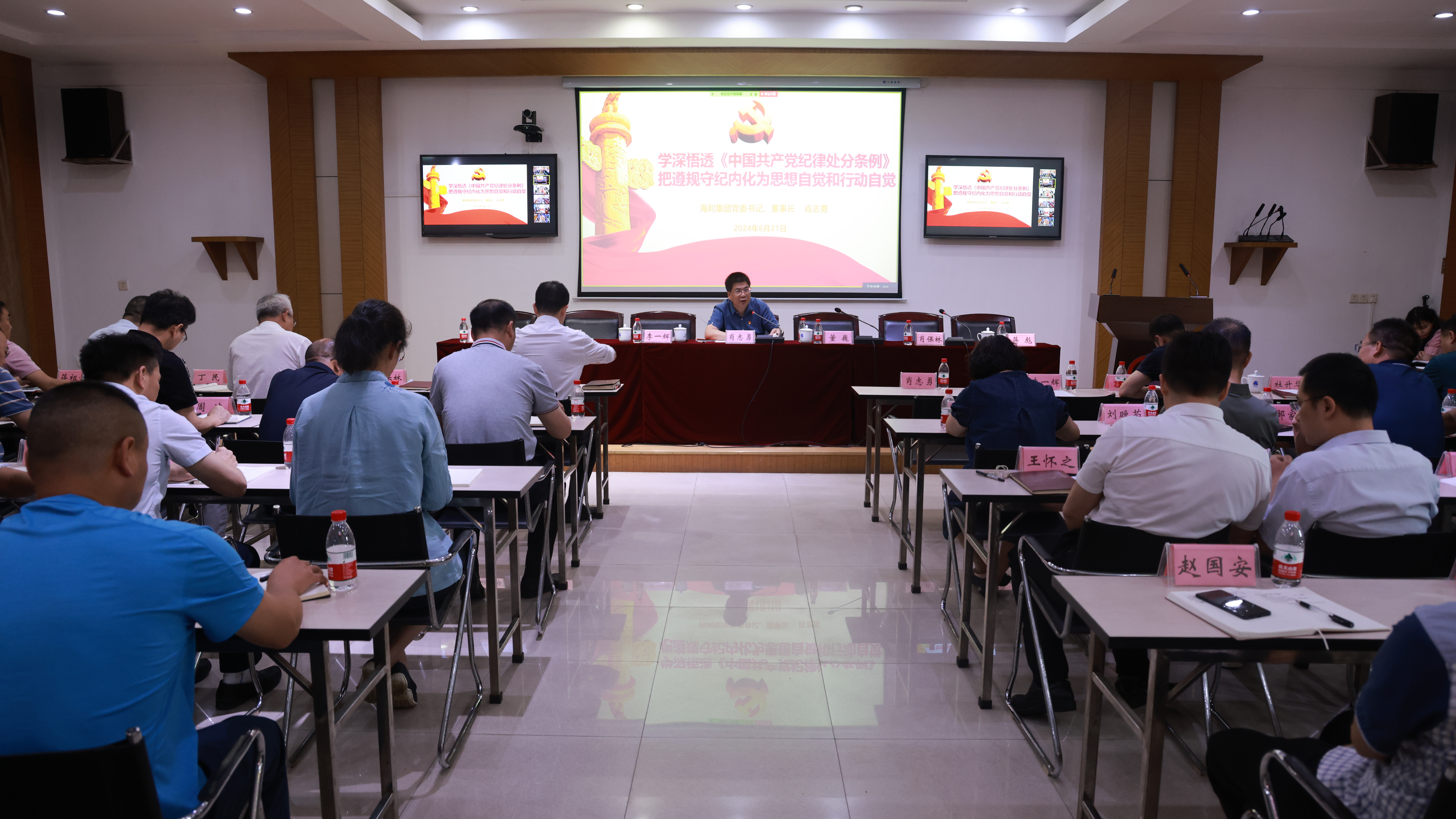 为推进党纪学习教育走深走实,海利集团党委书记、董事长肖志勇6月21日上午讲纪律党课。集团党委班子成员董巍、李一辉、肖保林、尹霖、蒋彪、杜升华和集团(股份)公司高管、集团总部各职能部门副职以上干部、在长各分子公司班子成员、近年集团新提拔干部及年轻干部代表、集团党委管理的非中共党员干部代表以及集团财务、采购、销售、项目管理等岗位骨干代表现场听课。常德公司、贵溪公司、涿州公司、宁夏公司、宏源公司班子成员,新提拔干部、年轻干部、非中共党员干部代表,财务、采购、销售等岗位骨干代表视频听课。